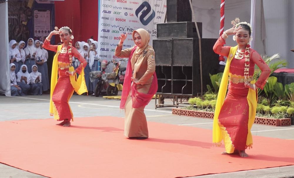 Dua pelajar dan guru menarikan tarian gambyong dalam penyambutan tamu saat Pameran Bursa Kerja/Job Fair di halaman SMKN 1 Batang, Kabupaten Batang, Senin (20/3/2023). Kasi SMK Cabang Dinas 13, Nuniek Mustikaningtyas Runtuweni mengatakan, kita harus menjadi contoh buat anak-anak, bahwa pelestarian seni budaya tradisional itu penting, lalu ditularkan ke keluarga dan masyarakat, supaya tertanam cinta tanah air. MC Batang, Jateng/Jumadi