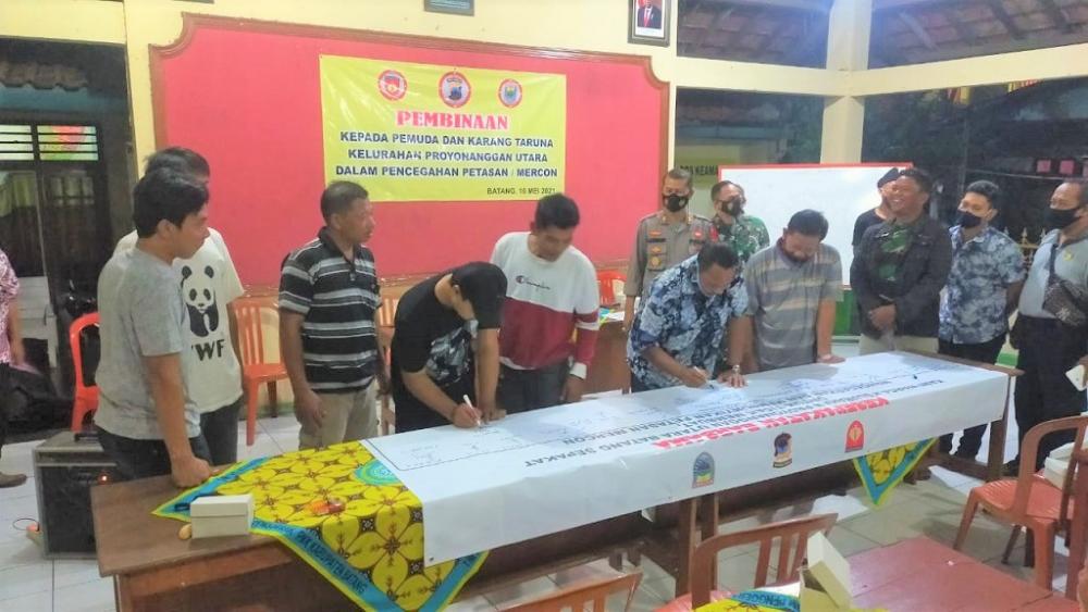 Batang - Jelang Idulfitri 1442 Hijriyah Forkopimcam Batang mengumpulkan ketua RT, RW tokoh masyarakat dan pemuda dalam rangka antisipasi petasan di Balai Pertemuan Kelurahan Proyonanggan Utara Kecamatan Batang, Kabupaten Batang, Selasa (11/5/2021).