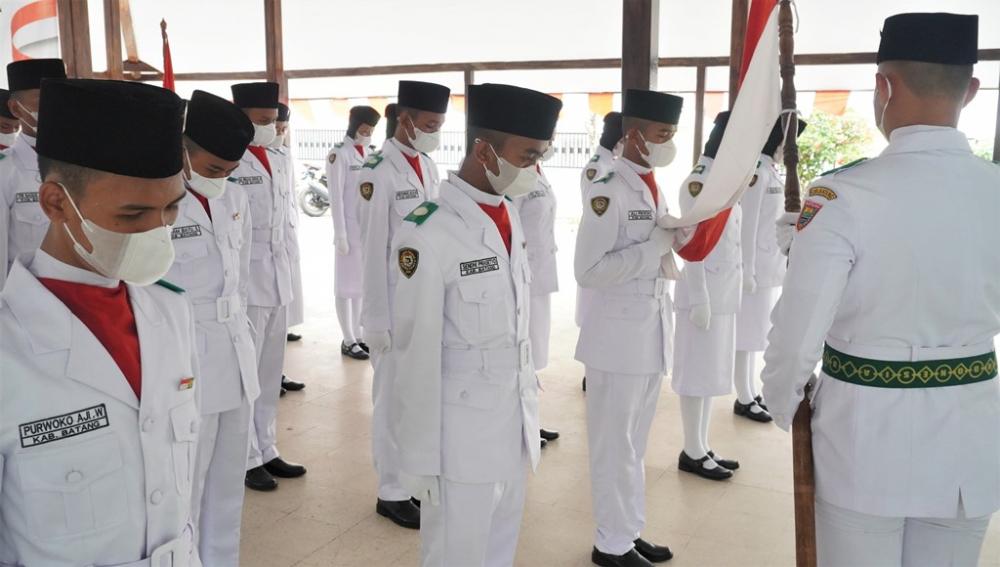 Seluruh anggota Anggota Pasukan Pengibar Bendera Pusaka (Paskibraka), merenungkan kesediahannya saat Upacara pengukuhan Paskibraka tahun 2021 secara virtual di Aula Kecamatan Kabupaten Batang, Kamis (12/8/2021). Renungan jiwa untuk membalikkan ingatan akan perjuangan dan pengorbanan mereka sampai bisa lolos sebagai Diklat Paskibraka 2021. MC Batang, Jateng/Roza/Jumadi