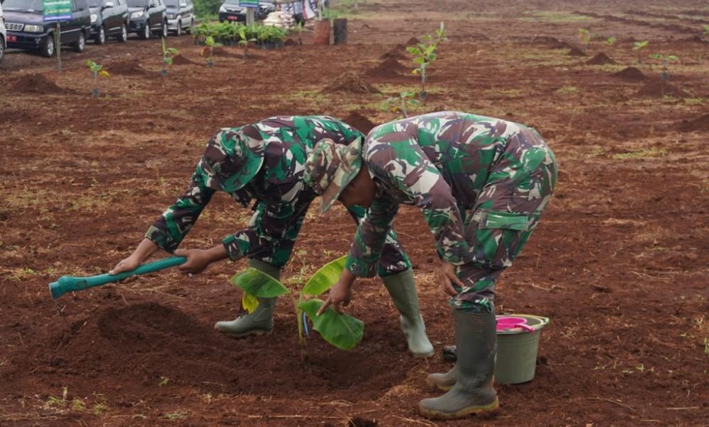 Dua orang anggota TNI Batang menanam pisang tanduk dan gebyar di Desa Tragung, Kecamatan Kandeman, Kabupaten Batang, Rabu (18/1/2023). Penanaman pohon pisang tanduk dan gebyar dipilih karena keduanya tanaman khas lokal Kabupaten Batang. Penanaman dilakukan dengan luasan lahan kurang lebih 1 Hektar. MC Batang, Jateng/Roza/Jumadi