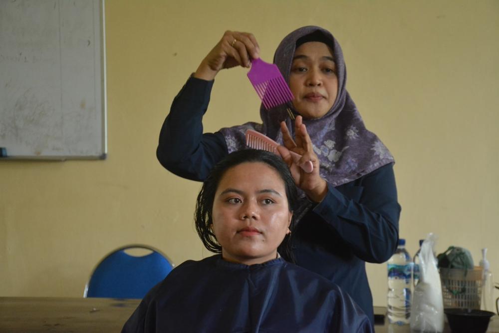 Instruktur tata rias Susiyanti (kanan), mempratikkan tata rias rambut saat Pelatihan Berbasis Kompetensi di Balai Latihan Kerja (BLK) Batang, Kabupaten Batang, Rabu (24/1/2024). Susiyanti menyampaikan, tata rias rambut ini bertujuan membuat penampilan rambut selalu rapi dan menarik. Pelatihan ini diikuti 16 peserta selama 33 hari. MC Batang, Jateng/Jumadi/Sri Rahayu
