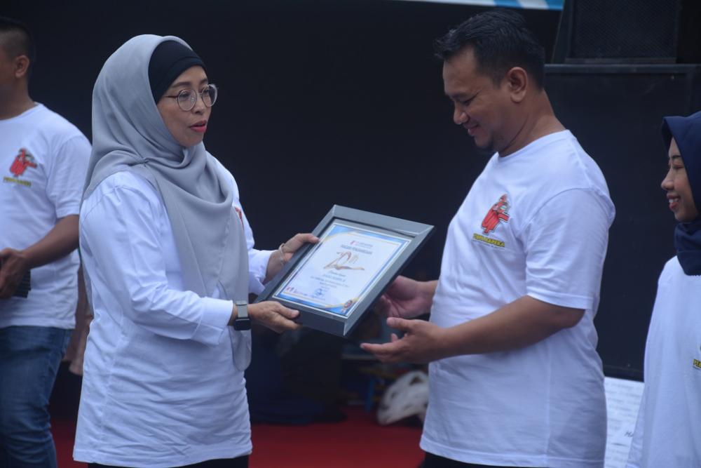 Penjabat (Pj) Bupati Batang Lani Dwi Rejeki (kiri) melalui BPR Bapera memberikan, penghargaan kepada karyawan Bapera saat Memperingati HUT Ke-20 Bapera di halaman Bapera Batang, Kabupaten Batang, Jumat (5/7/2024). Direktur BPR Bapera Batang Aji Setya Budi mengatakan, penghargaan ini diberikan kepada 11 karyawan/karyawati BPR Bapera masa kerja selama 20 tahun. MC Batang, Jateng/Jumadi/Sri Rahayu