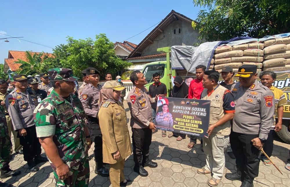 Kapolda Provinsi Jateng Inspektur Jenderal Irjen Ahmad Luthfi (tengah), menyerahkan bantuan semen untuk penanggulangan gempa di Desa Lebo, Kecamatan Warungasem, Kabupaten Batang, Senin (8/7/2024). Ahmad Luthfi mengatakan, bantuan 1.000 sak semen merupakan kepedulian polri terhadap bencana yang menimpa masyarakat Kabupaten Batang. MC Batang, Jateng/Roza/Jumadi