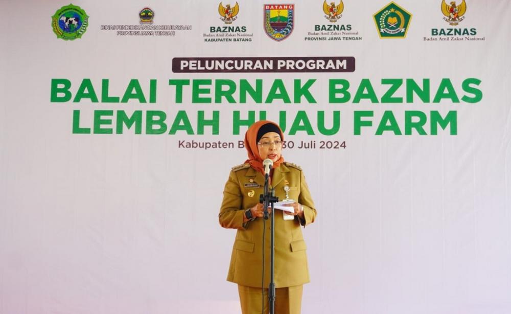 Penjabat (Pj) Bupati Batang Lani Dwi Rejeki memberikan sambutan saat peluncuran balai ternak Baznas di SMK Peternakan Lembah Hijau, Kecamatan Reban, Kabupaten Batang, Selasa (30/7/2024). Pj Bupati Batang mengatakan, program balai ternak yang diinisiasi Baznas RI di Kabupaten Batang dapat meningkat perekonomian masyarakat sekitar dalam bidang peternakan. MC Batang, Jateng/Roza/Jumadi