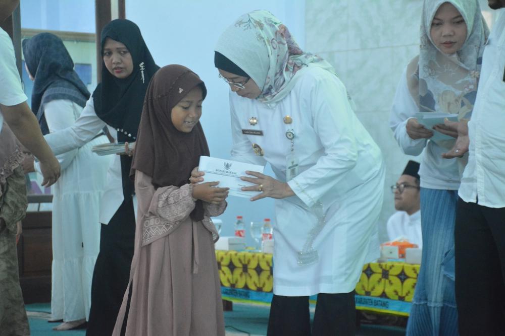 Penjabat (Pj) Bupati Batang Lani Dwi Rejeki (kedua kanan), melalui Unit Pengumpul Zakat (UPZ) memberikan bantuan kepada anak yatim saat Khotmil Quran di Masjid Jami Al Ikhlas, Kecamatan wonotungal, Kabupaten Batang, Jumat (27/9/2024). Bantuan diberikan kepada 10 anak yatim berupa uang tunai masing-masing mendapatkan Rp250 ribu. MC Batang, Jateng/Jumadi/Sri Rahayu