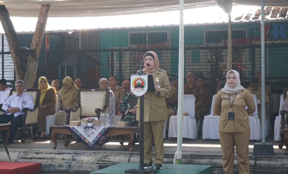 Penjabat (Pj) Bupati Batang Lani Dwi Rejeki (kedua kanan), memberikan sambutan saat Lomba Regu Peraturan Baris Berbaris (PBB) Tingkat SLTP dan SLTA sederajat dalam rangka Hari Ulang Tahun Ke-79 Tentara Nasional Indonesia di Jalan Veteran Batang, Kabupaten Batang, Senin (30/9/2024). Pj Bupati Batang mengatakan, Lomba PBB tidak hanya tentang baris berbaris saja, tetapi juga untuk meningkatkan rasa cinta tanah air, kedisiplinan, jiwa kepemimpinan, dan rasa percaya diri yang tinggi. MC Batang, Jateng/Ardhy/Jumadi