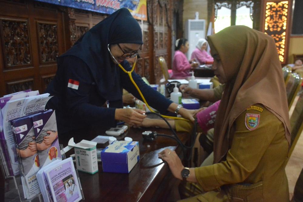 Petugas Rumah Sakit QIM (kiri), memeriksa tekanan darah salah satu Aparatur Sipil Negara (ASN), dalam memeriahkan HUT Korpri Ke-53 di Aula Bupati Batang, Kabupaten Batang, Selasa (12/11/2024). Ketua Korpri Batang Tulyono mengatakan, kegiatan ini bekerja sama dengan PMI cabang Batang kemudian cek kesehatan dengan Rumah Sakit QIM. Yaitu tesnya ada tiga kegiatan yang pertama gula darah, asam urat, dan tekanan darah. MC Batang, Jateng/Jumadi/Sri Rahayu