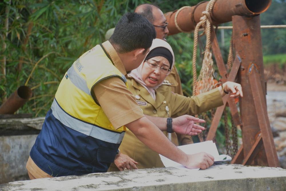 Penjabat (Pj) Bupati Batang Lani Dwi Rejeki (kanan), meninjau progres perbaikan jembatan di Jembatan Kali Belo, Kecamatan Tersono, Kabupaten Batang, Senin (3/2/2025). Pj Bupati Batang mengatakan, meski pembangunan memakan waktu yang cukup cepat, akan tetapi tidak dapat dilalui oleh kendaraan pribadi dengan tonase tertentu. Maksimal kurang dari 10 hari sudah bisa dilalui kendaraan pribadi, dengan dipasang portal agar tidak semua boleh melintas karena batasan tonase kurang dari 4 ton. MC Batang, Jateng/Jumadi/Sri Rahayu