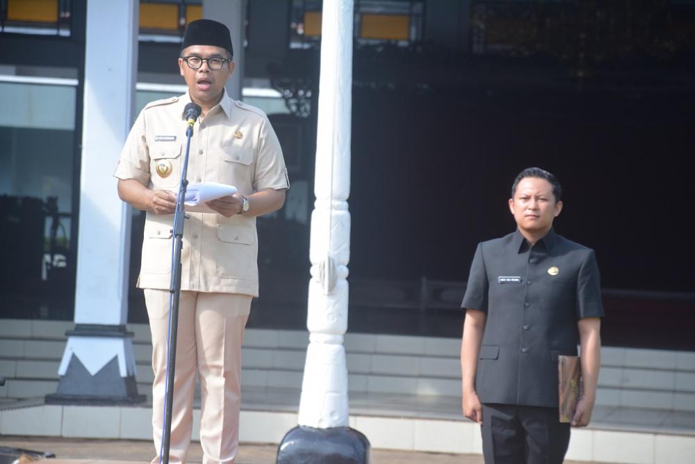 Bupati Batang M. Faiz Kurniawan (kiri), memberikan sambutan saat upacara Memperingati Hari Kartini Ke-146 di halaman Pendapa Kabupaten Batang, Senin (21/4/2025). Bupati Batang mengatakan, Pemkab Batang berkomitmen menciptakan lingkungan yang kondusif bagi pengembangan wanita melalui berbagai program dan kebijakan yakni peningkatan kualitas pendidikan dan kesehatan wanita serta kesetaraan ekonomi Perempuan. MC Batang, Jateng/Jumadi/Sri Rahayu