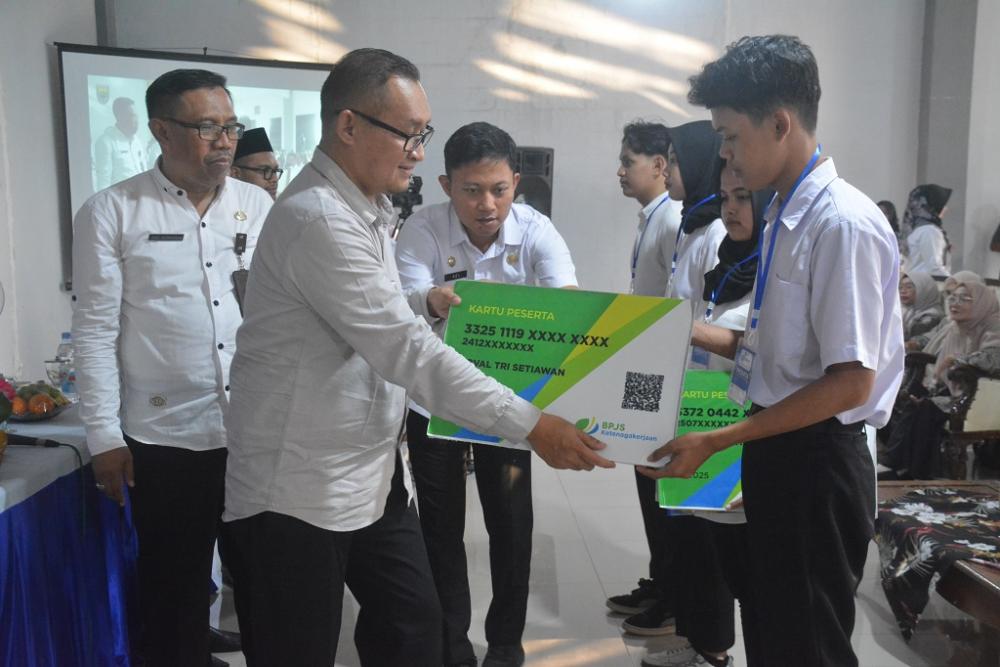 Kepala Kantor BPJS Ketenagakerjaan Cabang Batang Haryo Wicaksono Yudho Prabowo (kedua kiri), menyerahkan secara simbolis kartu kepesertaan BPJS Ketenagakerjaan pada peserta pelatihan program Dapat Kerja (Daker) di Aula BLK Batang, Kabupaten Batang, Rabu (9/7/2025). Haryo Wicaksono Yudho Prabowo mengungkapkan, bahwa selama pelatihan, peserta akan dilindungi oleh BPJS Ketenagakerjaan dengan dua program Jaminan kematian (JKm) dan Jaminan Kecelakaan Kerja (JKK). Ini sebagai komitmen dan jaminan dalam melindungi pekerja atau peserta pelatihan. MC Batang, Jateng/Jumadi/Sri Rahayu