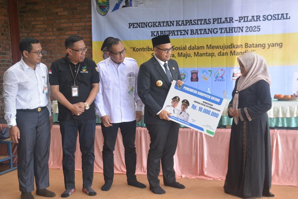 Bupati Batang M. Faiz Kurniawan (kedua kanan), melalui BPJS Ketenagakerjaan menyerahkan santunan kematian kepada ahli waris usai Peningkatan kapasitas pilar-pilar sosial di Agro Wisata Blado, Kabupaten Batang, Rabu (1/10/2025). Bupati Batang menekankan, pentingnya program BPJS Ketenagakerjaan sebagai bentuk perlindungan negara bagi para pekerja. Program ini tidak hanya menyasar pekerja sektor formal, tetapi juga sektor informal, seperti pekerja penerima upah maupun bukan penerima upah. MC Batang, Jateng/Jumadi/Sri Rahayu