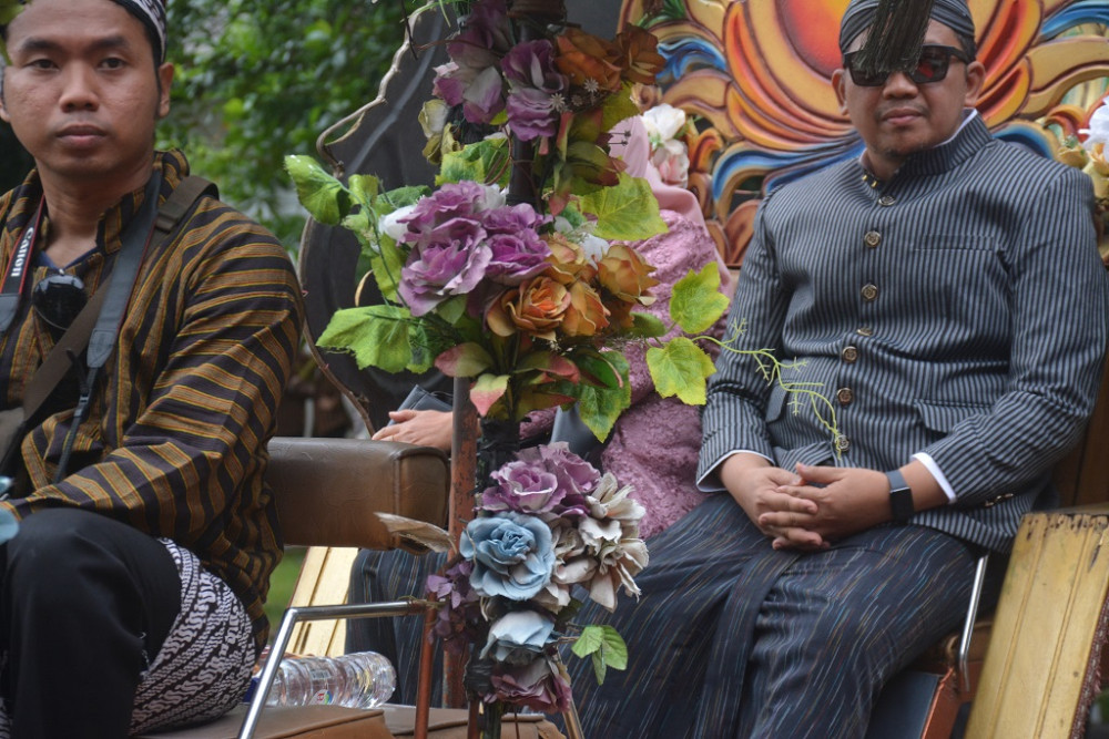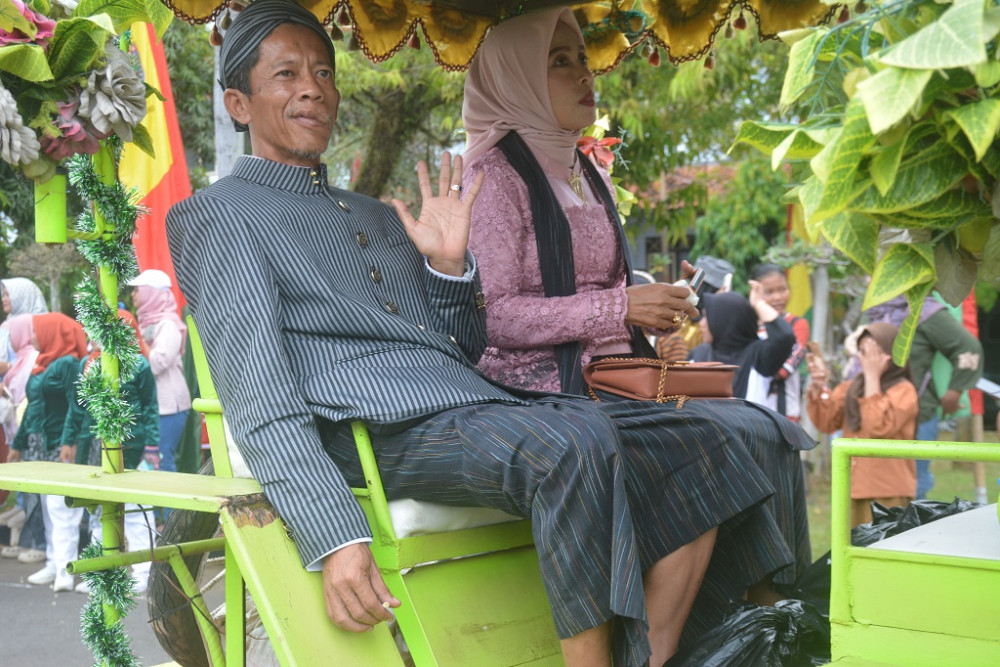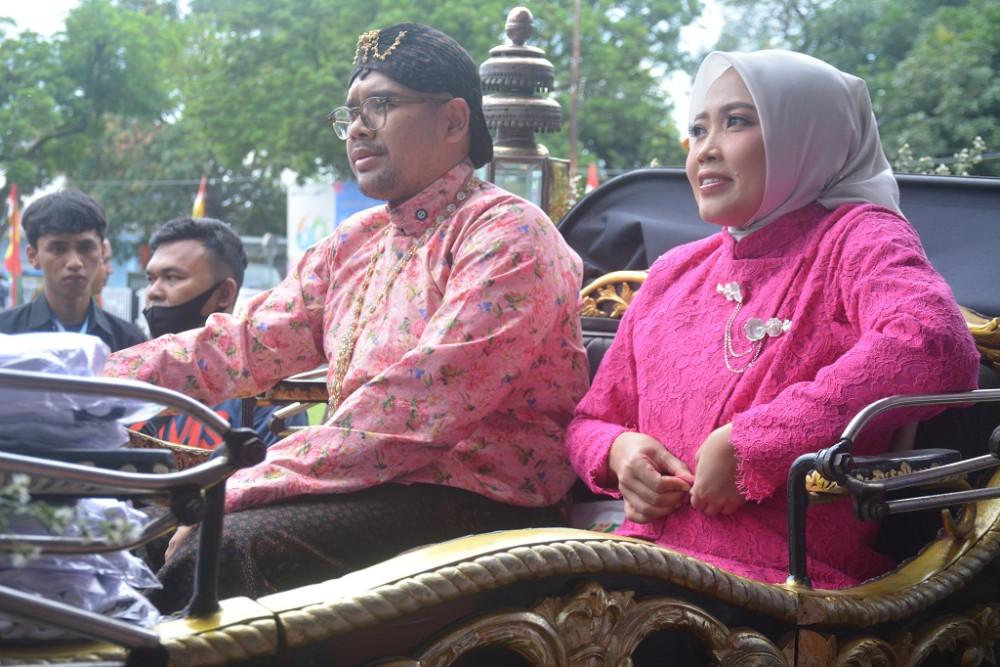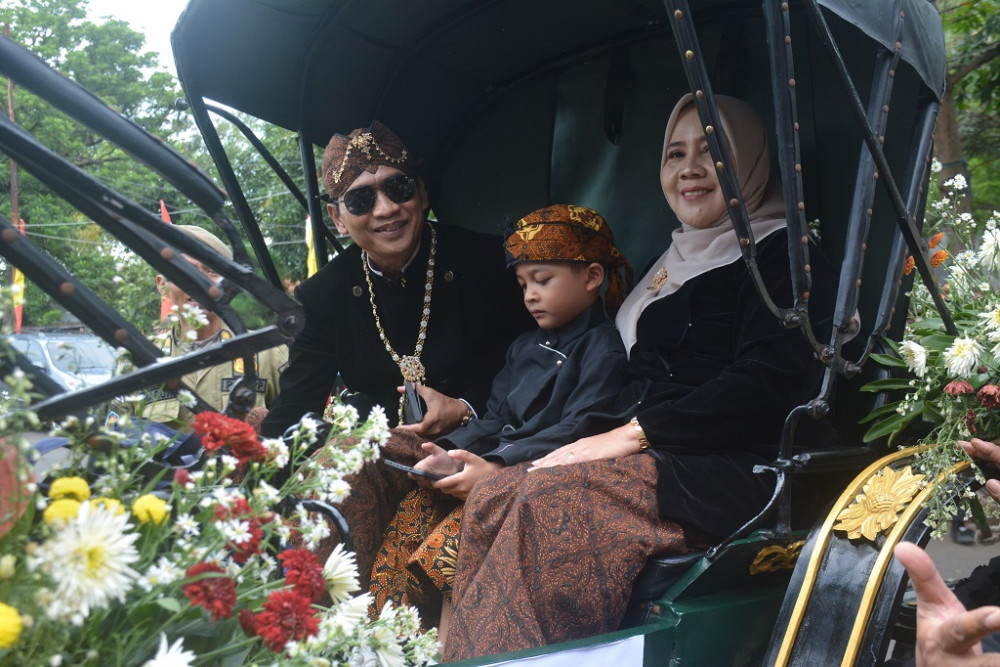 Bupati Batang M. Faiz Kurniawan (kiri) dan Ketua TP PKK Batang Faelasufa Faiz mengenakan busana ala Jogja saat Kirab Budaya dalam rangka HUT Ke-60 Kabupaten Batang di halaman Pendopo Kabupaten Batang, Minggu (12/4/2026). Bupati Batang mengatakan, kirab budaya tahun ini Kabupaten Batang lebih mengarah ke Keraton Ngayogyakarta Hadiningrat mengingat ada kedekatan kesejarahan dengan era Kesultanan Mataram Islam. MC Batang, Jateng/Jumadi