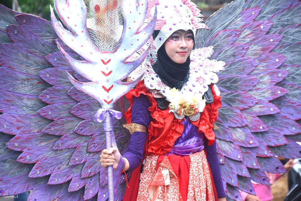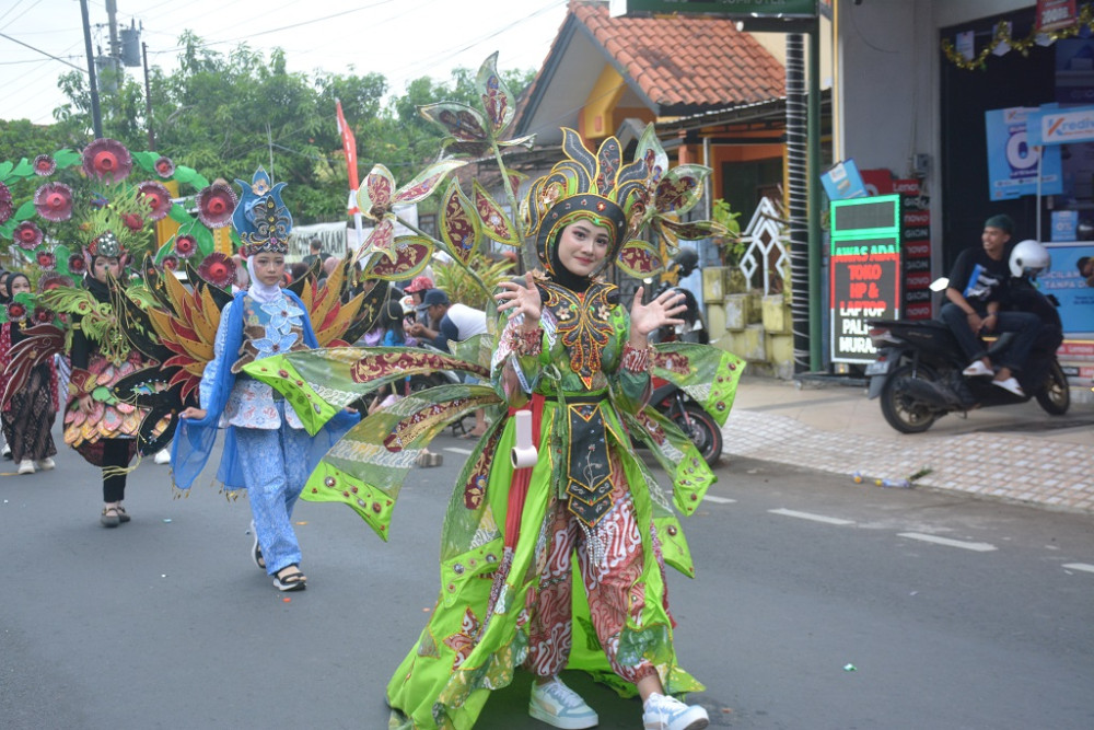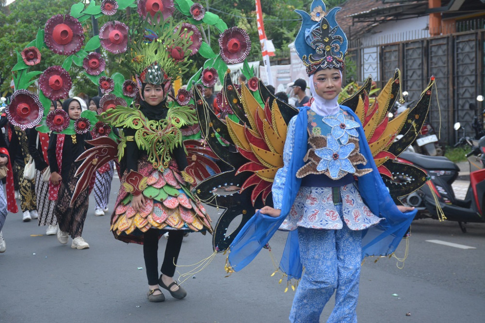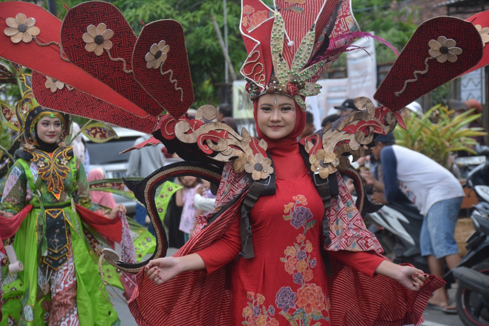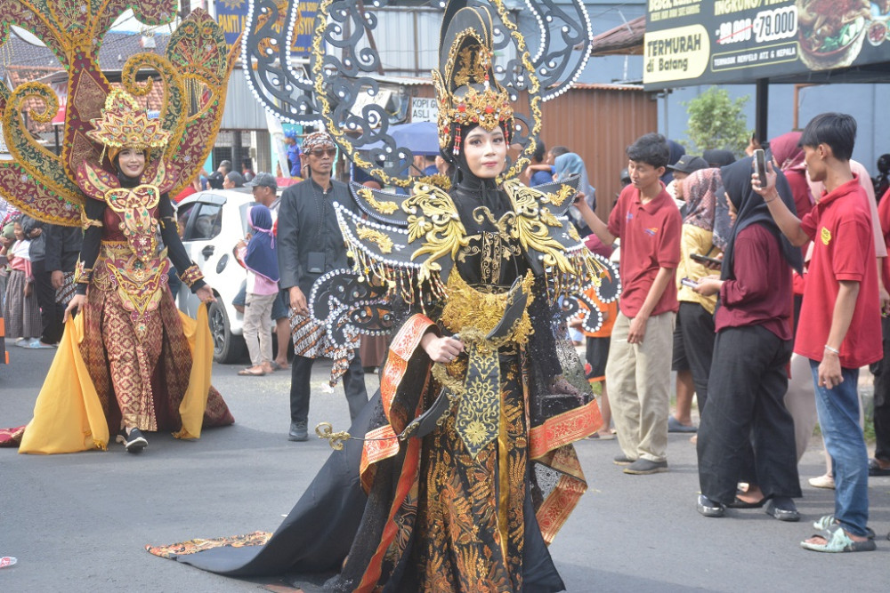 Dua Aparatur Sipil Negara (ASN) Setda Batang mengenakan kostum Laksmini dan Srikandi saat Kirab Budaya dalam rangka HUT Ke-60 Kabupaten Batang di Jalan Ahmad Yani Batang, Kabupaten Batang, Minggu (12/4/2026). Lurah Kirab Budaya Batang Bambang Suryantoro Sudibyo mengatakan, sebanyak 86 kelompok dengan total lebih dari 1.600 peserta mengikuti Kirab Budaya mulai dari Pelajar, ASN, TNI, Polri hingga Tokoh Masyarakat. MC Batang, Jateng/Jumadi