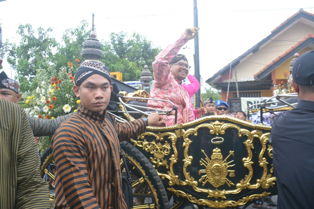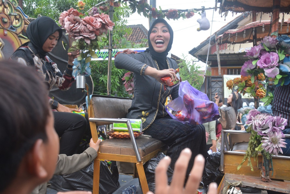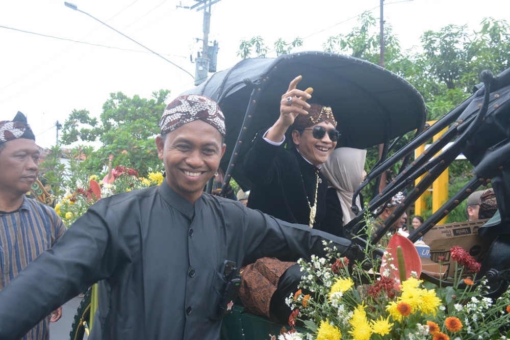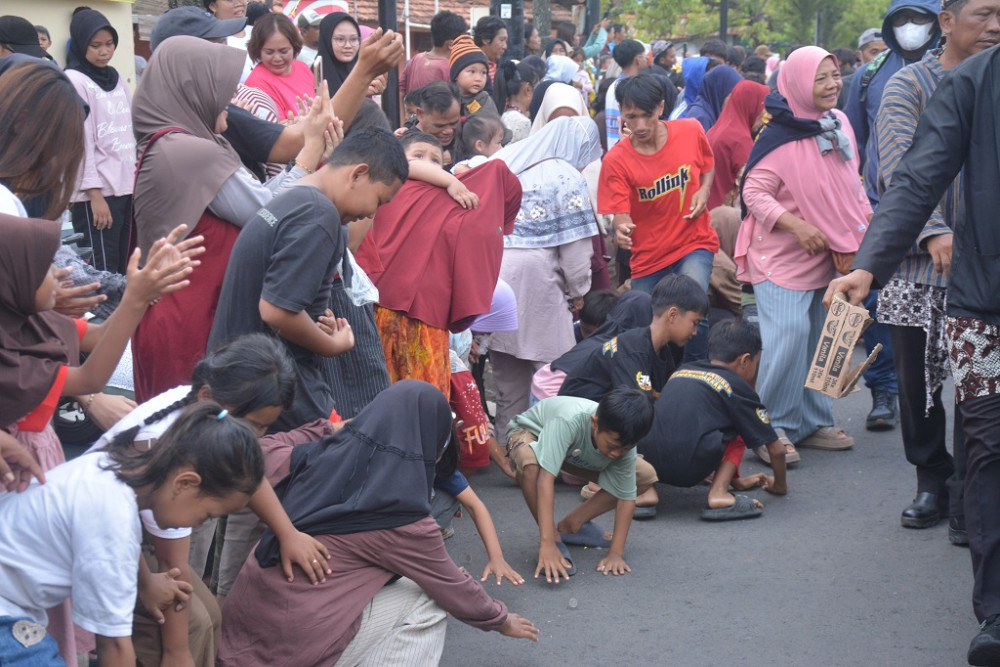 Bupati Batang M. Faiz Kurniawan (tengah), melempar uang koin (sawur koin), saat Kirab Budaya dalam rangka HUT Ke-60 Kabupaten Batang di Jalan Ahmad Yani Batang, Kabupaten Batang, Minggu (12/4/2026). Bupati Batang mengatakan, sawur koin adalah tradisi menebar uang koin yang rutin dilakukan saat Kirab Budaya HUT Kabupaten Batang. Tradisi ini melambangkan syukur, berbagi rezeki, tolak bala, dan harapan kemakmuran bagi warga. MC Batang, Jateng/Jumadi