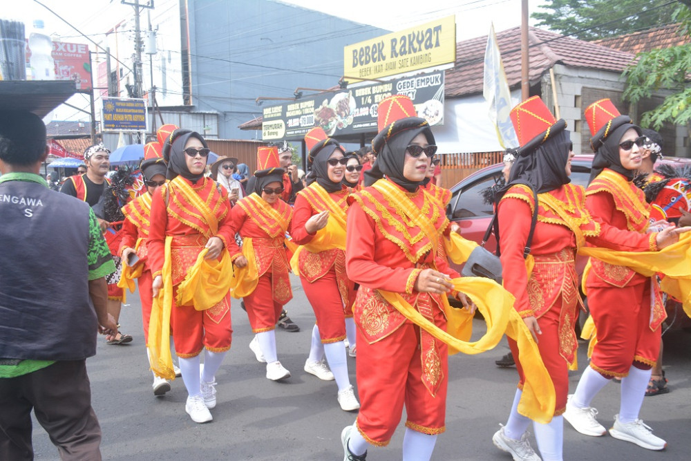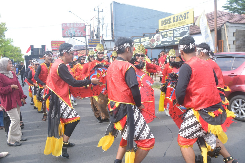 Sejumlah peserta kirab melakukan pertunjukan tari babalu saat Kirab Budaya dalam rangka HUT Ke-60 Kabupaten Batang di Jalan Ahmad Yani Batang, Kabupaten Batang, Minggu (12/4/2026). Tari Babalu adalah tarian tradisional khas Kabupaten Batang, yang menggambarkan perjuangan melawan penjajah dengan gerakan dinamis dan simbolis. MC Batang, Jateng/Jumadi