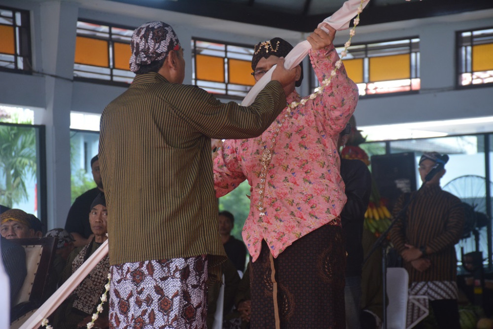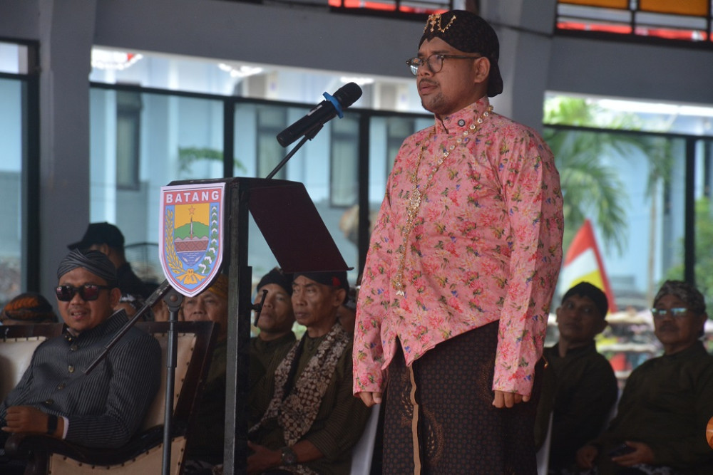 Bupati Batang M. Faiz Kurniawan (kiri), memberikan sambutan usai Kirab Budaya dalam rangka HUT Ke-60 Kabupaten Batang di halaman Pendopo Kabupaten Batang, Minggu (12/4/2026). Bupati Batang mengatakan, kirab budaya haruslah terus dilestarikan, untuk memperkuat akar budaya dan kearifan lokal kepada generasi muda. Dalam kirab tersebut, tradisi sawur tetap dilestarikan sebagai simbol pemimpin yang membagikan kebahagiaan bagi kesejahteraan rakyatnya. MC Batang, Jateng/Jumadi