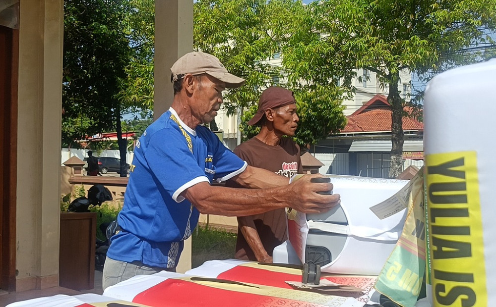 Salah satu Petugas (kanan), Kelompok Bimbingan Ibadah Haji dan Umrah (KBIHU) mencatat koper jemaah calon haji menjelang pemberangkatan ke Embarkasi Donohudan Solo, di Gedung Pramuka, Kabupaten Batang, Kamis (23/4/2026). Kepala Kantor Kementerian Haji dan Umrah Batang Siti Mahmudah menegaskan, selain hanya membawa barang-barang yang dibutuhkan, jemaah juga tidak diperkenankan membawa benda-benda yang membahayakan. Jika tetap dilanggar, tentu oleh petugas akan dibongkar saat dilakukan pengecekan. MC Batang, Jateng/Jumadi