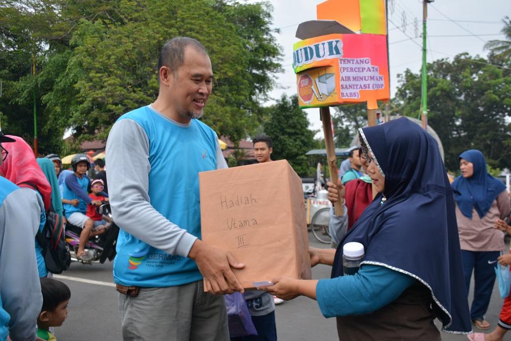 Kepala Puskesmas Batang II Joko Prasetidjo (kiri), memberikan hadiah kepada warga dalam Car Free Day Kampanye Germas di Jalan Veteran Kabupaten Batang, Minggu (15/9/2019). Hadiah diberikan setelah melakukan cek kesehatan dan menjawab pertanyaan yang diberikan oleh panitia. MC Batang, Jateng/Jumadi/Ardhy