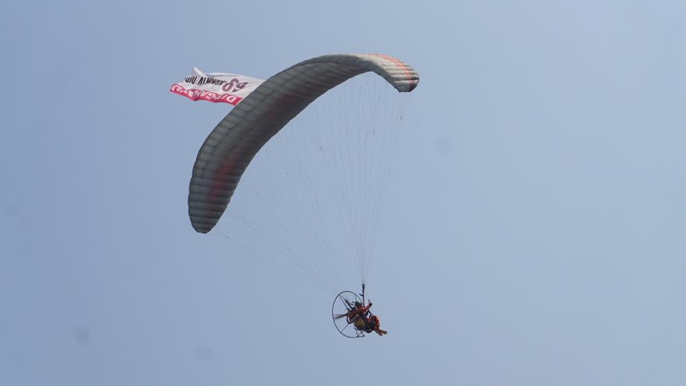 Pilot paralayang, menampilkan aksinya dalam olahraga paragliding saat Peringatan Hari Ulang Tahun (HUT) Tentara Nasional Indonesia (TNI) ke-74 dan Kodam IV/Diponegoro ke-69 di Alun-alun Kabupaten Batang, Rabu (18/9/2019). HUT TNI dan Kodam dihadiri oleh Wakil Gubernur Jawa Tengah Taj Yasin Maimoen, Forum Koordinasi Pimpinan Daerah Kabupaten Batang, Organisasi Perangkat Daerah, Organisasi Masyarakat, dan anggota TNI se-Jawa Tengah. MC Batang, Jateng/Roza/Ardhy