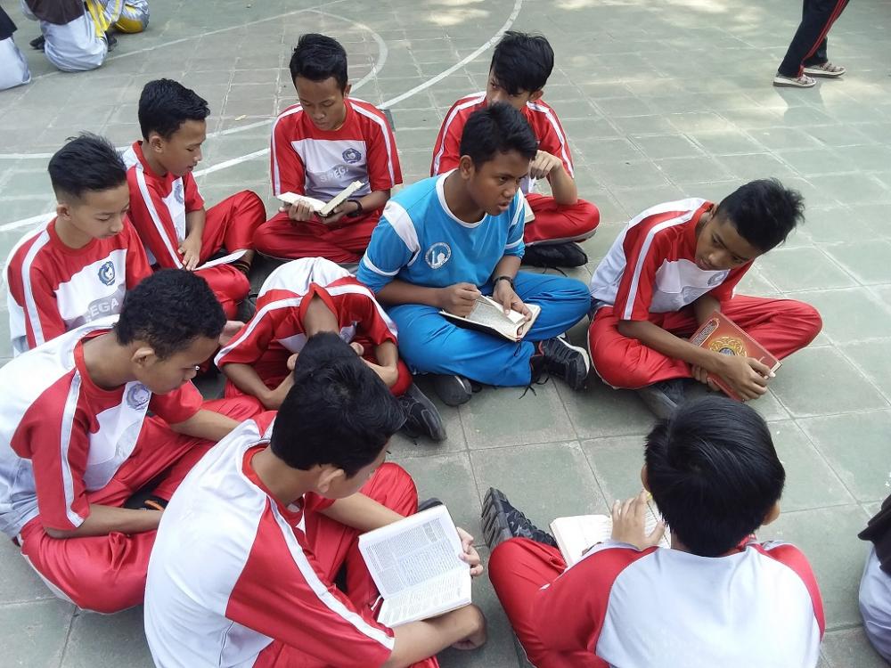 Sejumlah pelajar, menghafalkan ayat-ayat suci Alquran di halaman SMPN 3 Kabupaten Batang, Sabtu (21/9/2019). Wakil Kepala SMPN 3 Batang Eminingsih mengatakan, setelah selesai melaksanakan kegiatan, anak-anak selalu memanfaatkan waktu luang untuk belajar ilmu agama, termasuk menghafalkan ayat Alquran. MC Batang, Jateng/Heri/Ardhy