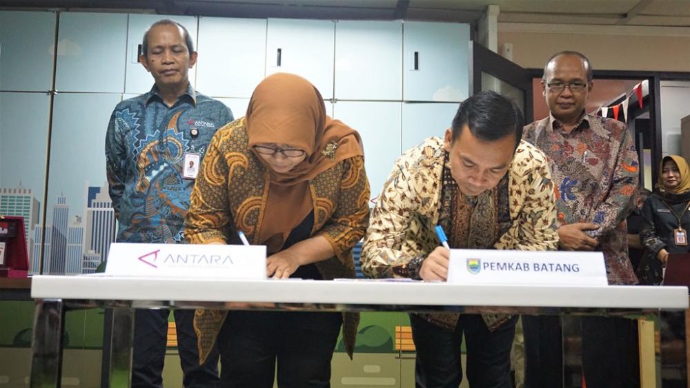 Bupati Batang Wihaji (kedua kanan) dan Sekretaris Perusahaan Perum Lembaga Kantor Berita Nasional ANTARA Iswahyuni (kedua kiri), menandatangani Nota Kesepahaman atau Memorandum of Understanding (MoU) di kantor ANTARA Digital Media Jakarta, Rabu (25/9/2019). Bupati Batang mengatakan kerjasama dengan ANTARA untuk memperkenalkan dan mempromosikan potensi Kabupaten Batang baik skala nasional maupun internasional melalui layanan informasi publik antara lain investasi, wisata, rencana pembangunan Transit Oriented Development, Pembangkit Listrik Tenaga Uap Batang yang berkekuatan 2 kali 1000 Mega Watt terbesar di ASEAN. MC Batang, Jateng/Roza/Ardhy