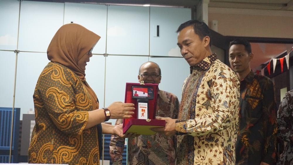 Sekretaris Perusahaan Perum Lembaga Kantor Berita Nasional (LKBN) ANTARA Iswahyuni (kiri), memberikan cinderamata kepada Bupati Batang Wihaji (kanan) di kantor ANTARA Digital Media Jakarta, Rabu (25/9/2019). Cinderamata merupakan simbol kerjasama antara Pemerintah Kabupaten Batang dengan LKBN ANTARA. MC Batang, Jateng/Roza/Ardhy