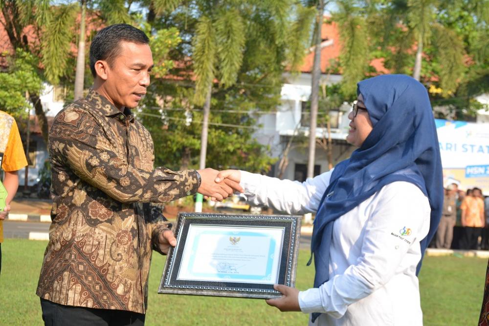 Bupati Batang Wihaji (kiri), memberikan penghargaan berupa piagam dukungan sensus penduduk 2020 kepada Kepala Badan Pusat Statistik Batang Tina Wahyufitri (kanan) di halaman Pendopo Kabupaten Batang, Kamis (26/9/2019). Kegiatan ini dalam rangka memperingati Hari Statistik Nasional Tahun 2019. MC Batang, Jateng/Jumadi/Ardhy