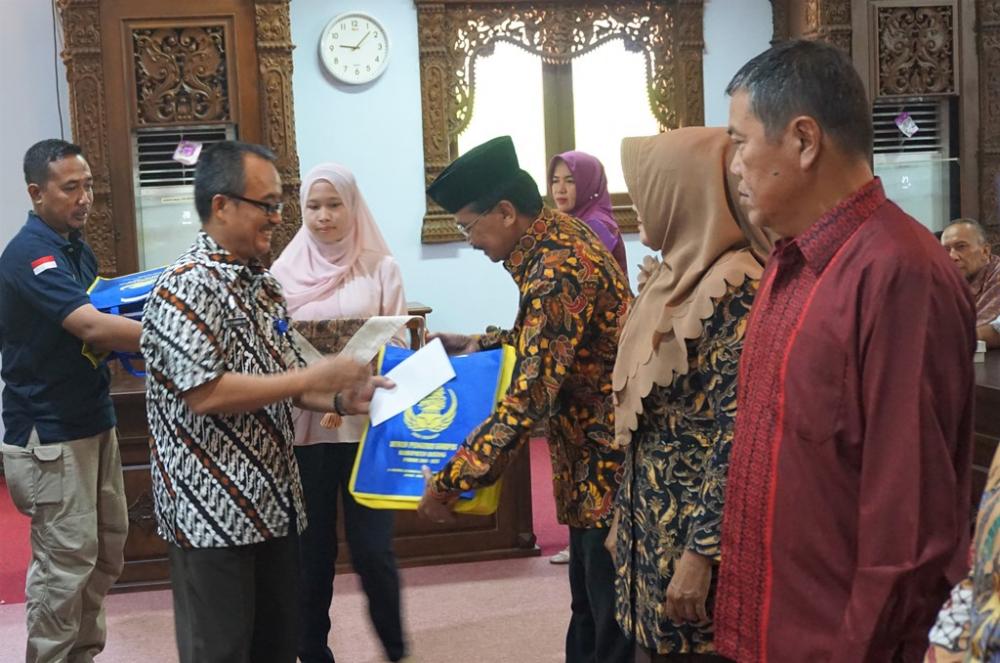 Sekretaris Daerah sekaligus Ketua Dewan Pengurus Korps Pegawai Republik Indonesia (DP KORPRI) Kabupaten Batang Nasikhin (kedua kiri), menyerahkan tali asih kepada sejumlah anggota KORPRI (kanan) di Aula Kantor Bupati Batang, Jumat (27/9/2019). Pemberian tali asih berupa uang sebesar Rp1 juta, ditambah piagam penghargaan dan souvenir. MC Batang, Jateng/Roza/Ardhy