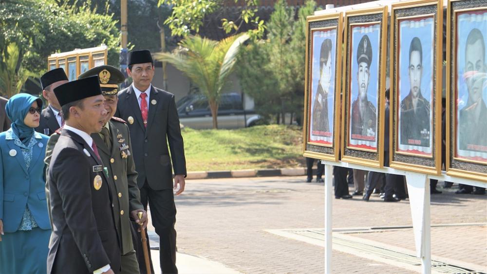 Bupati Batang Wihaji (kedua kiri), melihat foto pahlawan yang telah gugur usai Upacara Peringatan Hari Kesaktian Pancasila di halaman Pendopo Kantor Bupati Batang, Selasa (1/10/2019). Upacara diikuti oleh seluruh Aparatur Sipil Negara, Polri, Kodim, dan pelajar. MC Batang, Jateng/Roza/Ardhy
