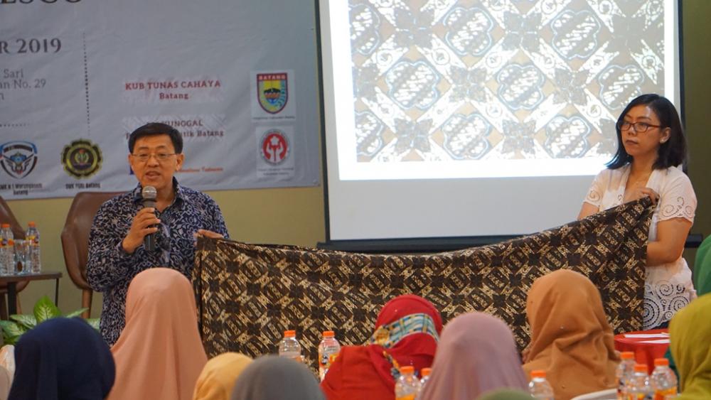 Peneliti Batik dari Institut Pluralisme Indonesia William Kwan Hwie Liong (kiri), menunjukan kain Batik Batangan kepada peserta dalam Diskusi Pengembangan Batik Batang di Hotel Sendang Sari Kabupaten Batang, Sabtu (5/10/2019). William mengatakan Batik Batangan khas Kabupaten Batang ini berawal dari Batik Sogan Batangan yang mempunyai motif Parang Karno. MC Batang, Jateng/Roza/Ardhy