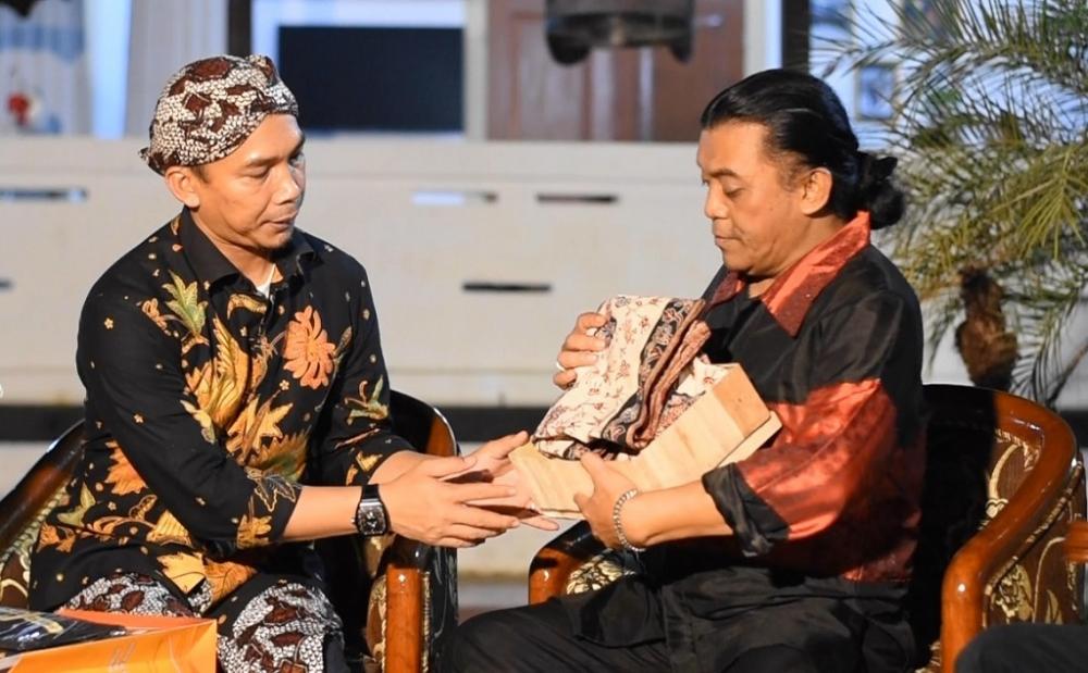 Bupati Batang Wihaji (kiri), memberikan cinderamata Batik Rifaiyah khas Batang kepada Didi Kempot (kanan) saat Konferensi Pers di Paviliun Rumah Dinas Bupati Batang, Senin (7/10/2019). Didi Kempot akan menjadi bintang tamu dalam penutupan Batang Expo 2019. MC Batang, Jateng/Jumadi/Ardhy