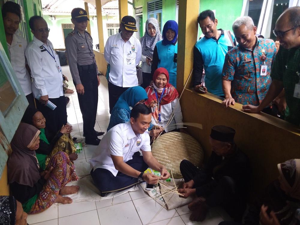 Bupati Batang Wihaji (tengah), belajar membuat wayang dari bambu saat Pencanangan Kampung Keluarga Berencana (KB) di Desa Sodong, Kecamatan Wonotunggal, Kabupaten Batang, Rabu (9/10/2019). Menurut Ketua Kampung KB Desa Sri Sumarni, wayang bambu dibuat oleh para lansia dan dijual dengan harga Rp5.000,00 per buah. MC Batang, Jateng/Heri/Ardhy