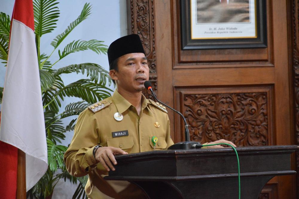 Bupati Batang Wihaji, memberikan sambutan saat upacara pelantikan dan pengambilan sumpah jabatan pejabat struktural dan pejabat fungsional di Aula Kantor Bupati Batang, Senin (14/10/2019). Bupati Batang berharap dengan adanya jabatan baru dapat bekerja sama guyub rukun membangun Kabupaten Batang. MC Batang, Jateng/Jumadi/Ardhy