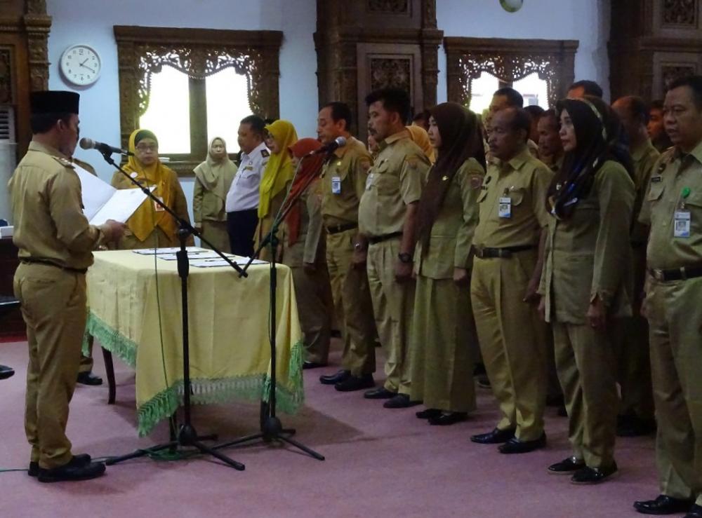 Bupati Batang Wihaji (kiri), melantik Pejabat Struktural dan Fungsional saat Upacara Pelantikan dan Pengambilan Sumpah atau Janji di Aula Kantor Bupati Batang, Senin (14/10/2019). Pejabat yang dilantik berjumlah 26 orang terdiri dari 21 Pejabat Struktural dan lima Pejabat Fungsional. MC Batang, Jateng/Umar/Ardhy