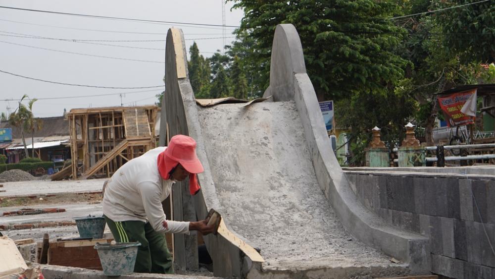 Seorang pekerja, membuat dinding perosotan saat proyek pembangunan Taman Sutomo di Jalan Dr. Sutomo, Kabupaten Batang, Kamis (17/10/2019). Pembangunan bersumber dari dana Anggaran Pendapatan dan Belanja Daerah Kabupaten Batang tahun 2019 oleh Dinas Perumahan Rakyat dan Kawasan Pemukiman di sisi barat sepanjang Jalan Dr. Sutomo. MC Batang, Jateng/Roza/Ardhy