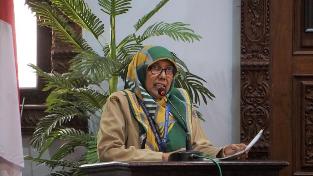 Kepala Dinas Kesehatan Kabupaten Batang Hidayah Basbeth, memberikan sambutan saat pertemuan advokasi Bupati dengan Kepala Desa dalam gerakan jamban sehat di Aula Kantor Bupati Batang, Senin (21/10/2019). Basbeth mengatakan STOP Buang Air Besar Sembarangan (BABS) akan memberikan manfaat antara lain, menjaga lingkungan menjadi bersih, sehat, nyaman dan tidak berbau, tidak mencemari sumber air, serta tidak mengundang serangga dan binatang yang dapat menyebar luaskan bibit penyakit, sehingga dapat mencegah penyakit menular. MC Batang, Jateng/Roza/Ardhy