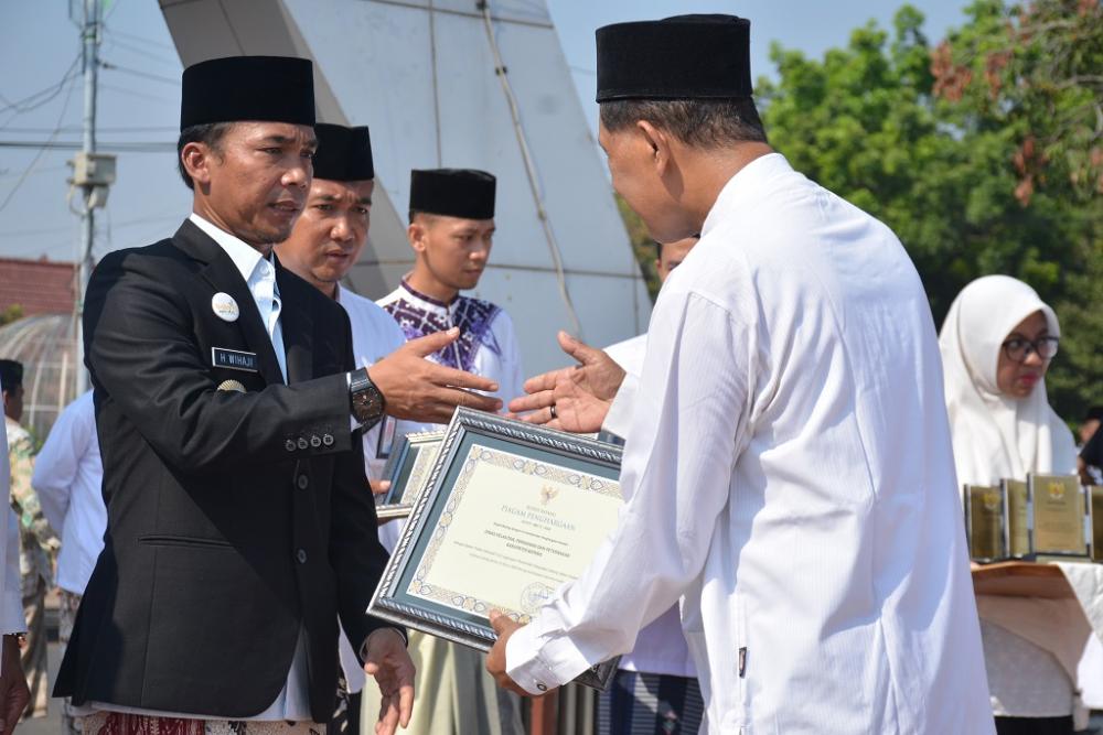Bupati Batang Wihaji (kiri), memberikan penghargaan pemeringkatan keterbukaan informasi badan publik usai Upacara Peringatan Hari Santri Nasional di Alun-Alun Kabupaten Batang, Selasa (22/10/2019). Penghargaan diberikan kepada 10 Organisasi Perangkat Daerah dan 10 Pemerintah Desa yang berhasil memenangkan uji keterbukaan informasi badan publik. MC Batang, Jateng/Jumadi/Ardhy