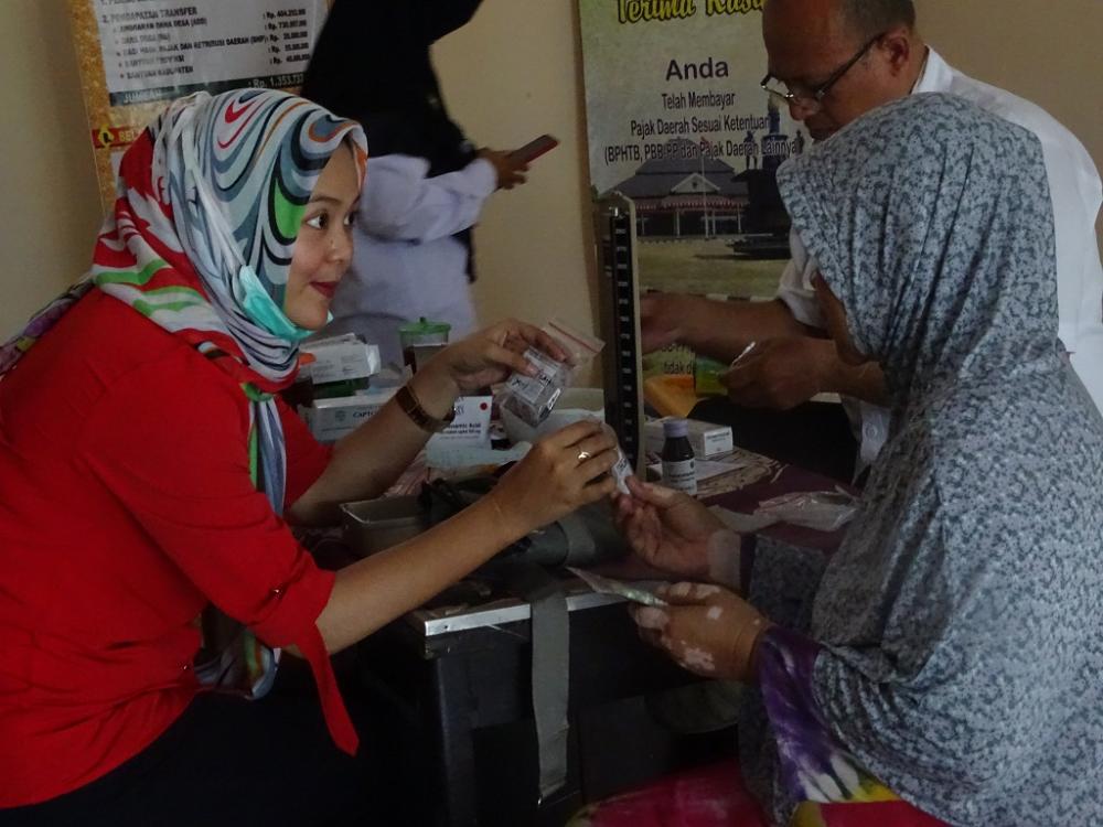 Seorang perawat (kiri), memberikan obat kepada pasien saat Puskesmas Keliling di Balai Desa Menguneng, Kecamatan Warungasem, Kabupaten Batang, Rabu (23/10/2019). Obat diberikan secara gratis kepada warga yang menggunakan Kartu Indonesia Sehat, Jamkesmas, dan Jamkesda, sedangkan jika pasien umum dikenakan biaya Rp10.000,00 per orang. MC Batang, Jateng/Umar/Ardhy