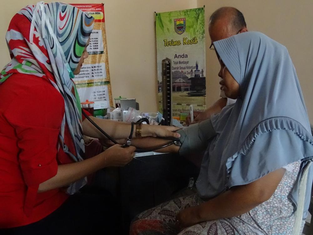 Seorang perawat (kiri), memeriksa pasien saat Puskesmas Keliling di Balai Desa Menguneng, Kecamatan Warungasem, Kabupaten Batang, Rabu (23/10/2019). Pemeriksaan diberikan secara gratis kepada warga yang menggunakan Kartu Indonesia Sehat, Jamkesmas, dan Jamkesda, sedangkan jika pasien umum dikenakan biaya Rp10.000,00 per orang. MC Batang, Jateng/Umar/Ardhy