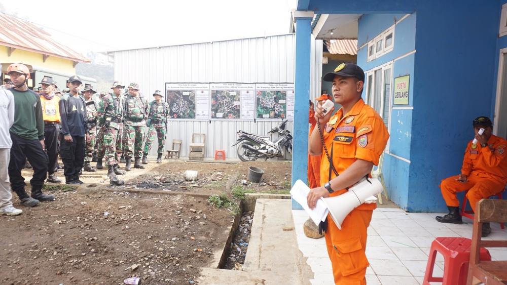 Koordinator Lapangan dari Badan Penanggulangan Bencana Daerah Kabupaten Batang Arif (kedua kanan), memberikan pengarahan simulasi saat Jambore Relawan Penanggulangan Bencana dalam rangka Kesiapsiagaan Rencana Kontijensi Bencana Erupsi Gas Beracun Gunung Api Dieng di Desa Gerlang, Kecamatan Blado, Kabupaten Batang, Minggu (27/10/2019). Arif mengatakan simulasi penanggulangan bencana ini digunakan sebagai contoh bagi warga masyarakat Gerlang apabila kemungkinan terjadi bencana gas beracun. MC Batang, Jateng/Ardhy