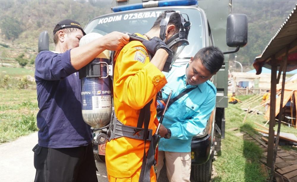 Dua relawan, membantu memasangkan alat bantu pernafasan saat Jambore Relawan Penanggulangan Bencana dalam rangka Kesiapsiagaan Rencana Kontijensi Bencana Erupsi Gas Beracun Gunung Api Dieng di Desa Gerlang, Kecamatan Blado, Kabupaten Batang, Minggu (27/10/2019). Kegiatan ini diikuti puluhan relawan se-Kabupaten Batang. MC Batang, Jateng/Ardhy