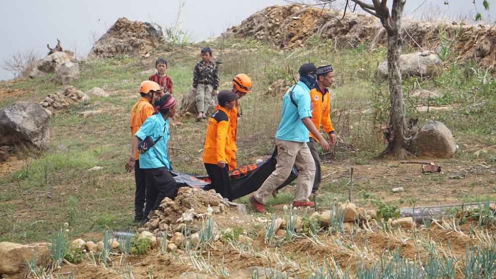 Sejumlah relawan, menolong korban meninggal dunia saat Jambore Relawan Penanggulangan Bencana dalam rangka Kesiapsiagaan Rencana Kontijensi Bencana Erupsi Gas Beracun Gunung Api Dieng di Desa Gerlang, Kecamatan Blado, Kabupaten Batang, Minggu (27/10/2019). Kegiatan ini diikuti puluhan relawan se-Kabupaten Batang. MC Batang, Jateng/Ardhy