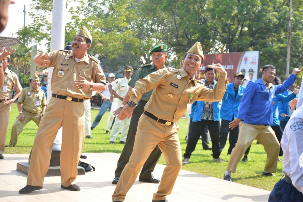 Bupati Batang Wihaji (tengah), melakukan flash mob Tari Babalu khas Batang usai Upacara Peringatan Hari Sumpah Pemuda ke-91 di halaman Pendopo Kabupaten Batang, Senin (28/10/2019). Flash mob Tari Babalu diikuti oleh seluruh peserta upacara yang terdiri dari Organisasi Perangkat Daerah, Tentara Nasional Indonesia, Organisasi Masyarakat, Komite Nasional Pemuda Indonesia serta pelajar di Kabupaten Batang. MC Batang, Jateng/Jumadi/Ardhy