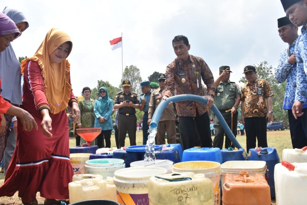 Wakil Bupati Batang Suyono (tengah), turut serta memberikan bantuan air bersih dalam Tentara Manunggal Membangun Desa (TMMD) Sengkuyung III di Desa Wonodadi, Kecamatan Bandar, Kabupaten Batang, Kamis (31/10/2019). Salah satu warga mengatakan kekeringan sudah terjadi sejak sebulan terakhir dan mengakibatkan sejumlah warga sulit mendapatkan air bersih. Penyaluran air bersih merupakan bantuan dari Perusahaan Daerah Air Minum Kabupaten Batang. MC Batang, Jateng/Edo/Ardhy