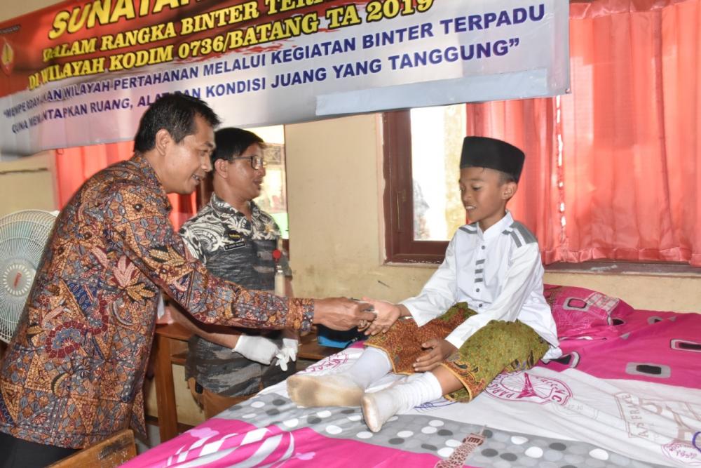 Wakil Bupati Batang Suyono (kiri), memberikan santunan kepada salah satu peserta sunat masal (kanan) di Desa Wonodadi, Kecamatan Bandar, Kabupaten Batang, Kamis (31/10/2019). Sunat masal merupakan salah satu rangkaian kegiatan dalam Tentara Manunggal Membangun Desa (TMMD) Sengkuyung III dan diikuti oleh puluhan anak setempat. MC Batang, Jateng/Edo/Ardhy