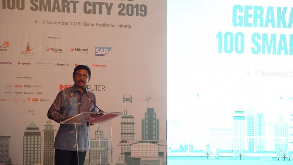 Menteri Komunikasi dan Informatika Republik Indonesia Johnny G. Plate, memberikan sambutan saat Evaluasi Gerakan Menuju 100 Smart City di Balai Sudirman, Kecamatan Tebet, Kota Jakarta Selatan, Senin (4/11/2019). Johnny G. Plate mengatakan Gerakan Menuju 100 Smart City merupakan salah satu upaya optimalisasi infrastruktur internet seperti Palapa Ring yang telah dibangun hingga ke pelosok-pelosok Nusantara agar menggenjot tingkat ekonomi dan sosial masyarakat, terutama di daerah-daerah yang sebelumnya relatif tertinggal dalam hal akses internet. MC Batang, Jateng/Egov/Ardhy