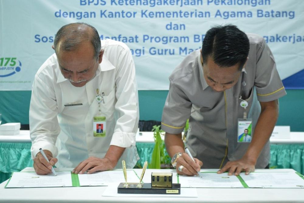 Kepala Kantor Kementerian Agama (Kemenag) Kabupaten Batang Taufik Rahman (kiri) dan Kepala Badan Penyelenggara Jaminan Sosial (BPJS) Ketenagakerjaan Cabang Batang Bambang Indriyanto (kanan), menandatangani Memorandum of Understanding (MoU) antara BPJS Ketenagakerjaan dengan Kemenag Batang di Hotel Dewi Ratih, Kabupaten Batang, Selasa (5/11/2019). Kegiatan ini diikuti oleh Perkumpulan Guru Madrasah Kabupaten Batang serta Kelompok Kerja Pengawas Pendidikan Madrasah Kabupaten Batang. MC Batang, Jateng/Jumadi/Ardhy