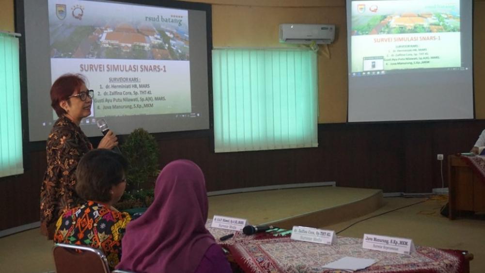 Salah satu tim surveyor Herminiati (kiri), memberikan materi saat survei simulasi snars edisi pertama di Aula Rumah Sakit Umum Daerah Kabupaten Batang, Rabu (6/11/2019). Herminiati mengatakan survei simulasi edisi pertama ini bertujuan agar rumah sakit dapat mempersiapkan pelaksanaan akreditasi dengan lebih baik, jadi jika ada kekurangan yang masih ada dapat segera diperbaiki oleh pihak rumah sakit. MC Batang, Jateng/Roza/Ardhy
