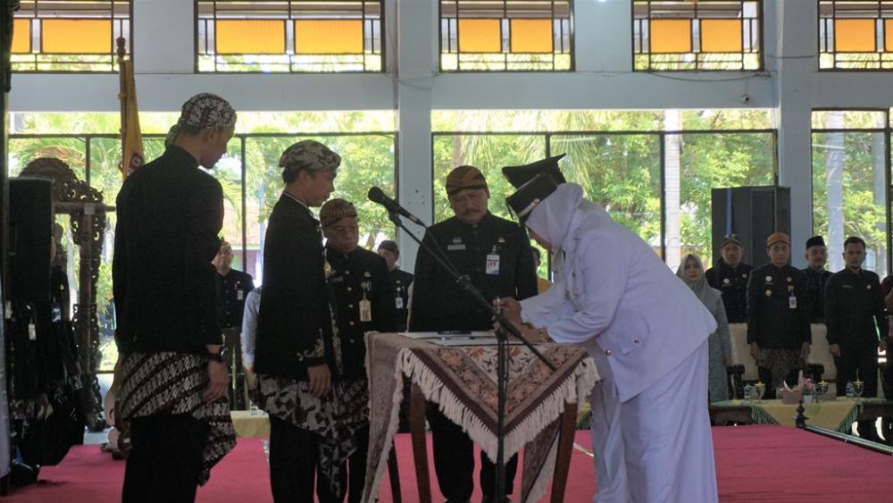 Sejumlah Kepala Desa (Kades) terpilih (kanan), menandatangani pakta integritas Kades di Pendopo Kabupaten Batang, Jumat (8/11/2019). Kegiatan ini dalam rangka pelantikan sumpah janji Kades periode jabatan tahun 2019 2025 gelombang pertama sebanyak 163 Kades se-Kabupaten Batang. MC Batang, Jateng/Roza/Ardhy