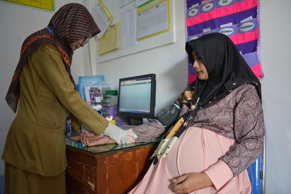 Petugas Pusat Kesehatan Masyarakat (Puskesmas) Batang II (kiri), mengecek atau memeriksa tekanan darah pasien ibu hamil di Puskesmas Batang II Kabupaten Batang, Selasa (12/11/2019). Petugas mengatakan pemeriksaan bertujuan untuk mengetahui tekanan darah pasien di usia kehamilan Trimester 2. MC Batang, Jateng/Jumadi/Ardhy
